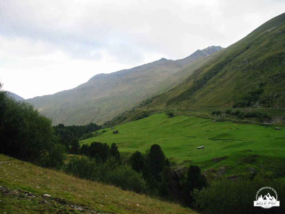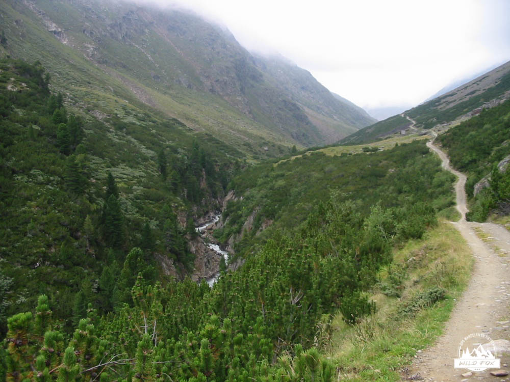 Nadat u het hele dorp bent gepasseerd en de Niedertalbach-rivierbrug bent overgestoken, komt u bij een kruispunt, waar ongeveer de helft van de toeristen verder gaat op een comfortabel pad langs de Rofenache-rivier naar Rofen en verder. Ons pad klimt echter voor de eerste en steilste keer op de route naar het huisje van Martin Busch. Bij het beklimmen van de weilanden naar de kaap boven de canyon is het nodig om ongeveer 100 hoogtemeters te bedwingen.