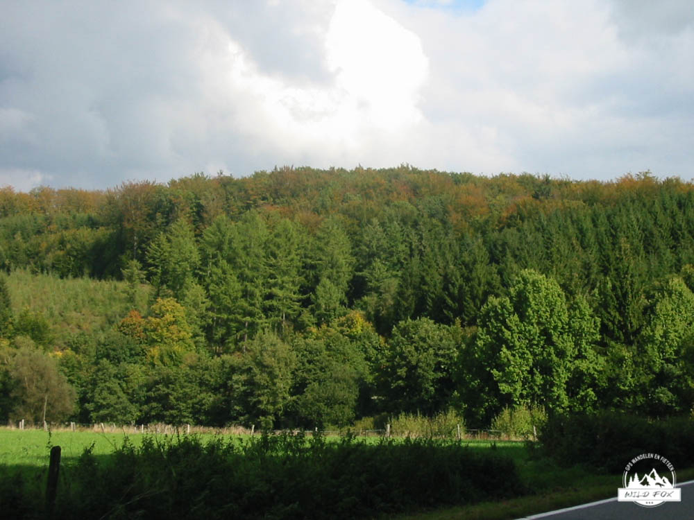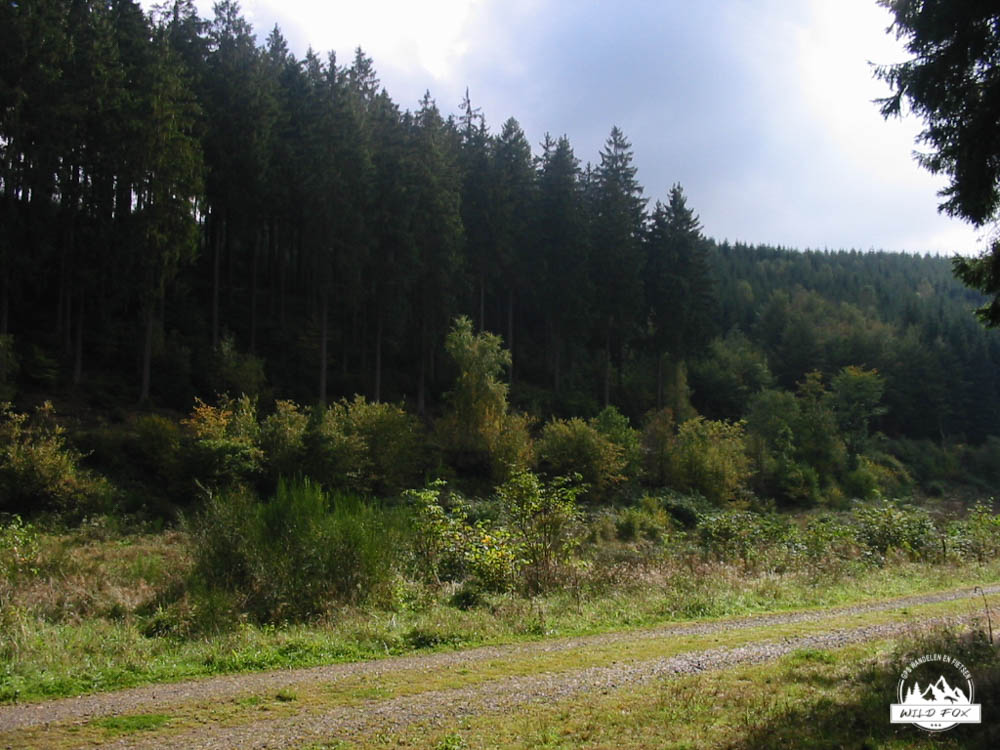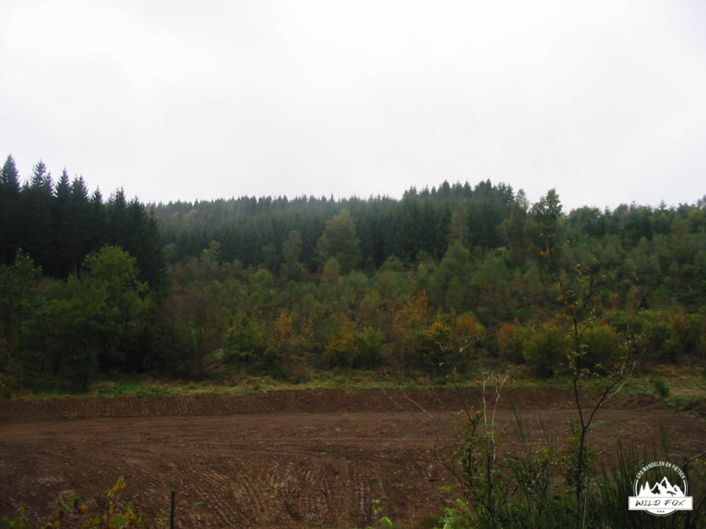 We wandelen eerst langs de gewestweg om daarna het bos in te duiken. Volgens ons wordt er in dit bos weinig gewandeld, de wandelpaden zijn immers redelijk hard begroeid met planten en gras. We stappen bergop, volgens de GPS gaan we tot halverwege bergop, om daarna de 2e helft van de wandeling alleen nog maar bergaf te gaan. De wandeling loopt door een dicht sparrenbos, en we passeren ook een weide mat Galway runderen.