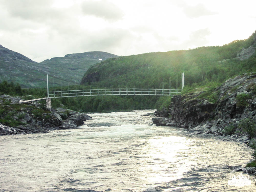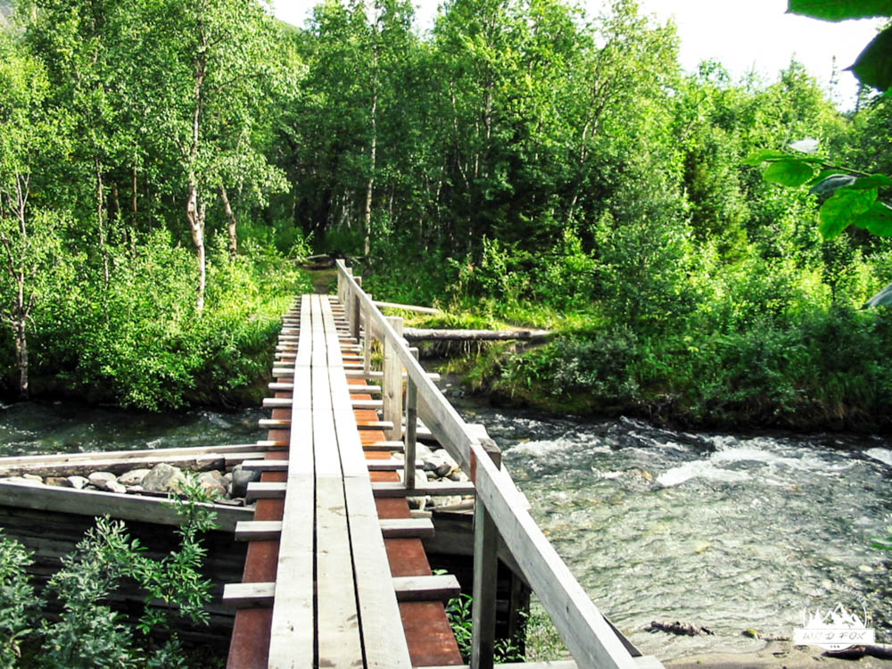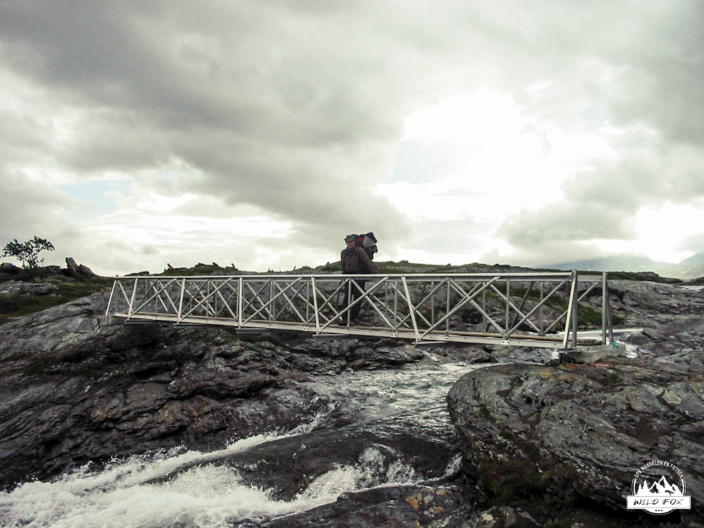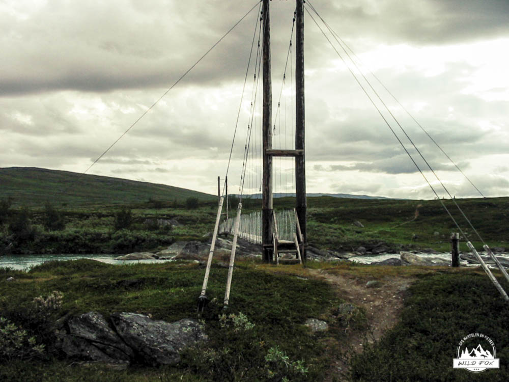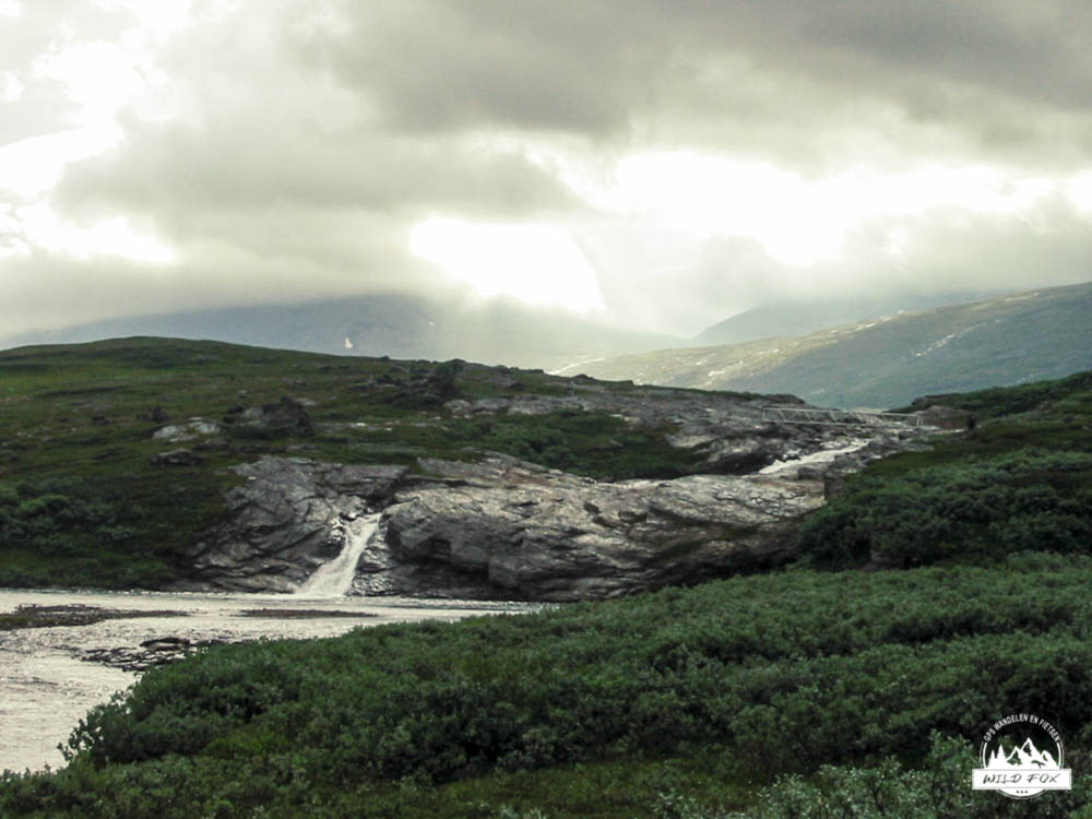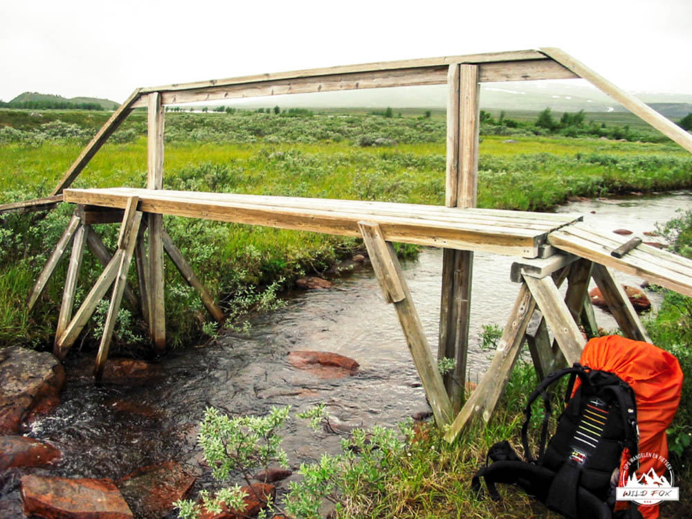 Tegen het einde van de wandeling werd de tocht lastiger, het ging meer op en af en er waren geen vlakke stukken meer. Vaak liepen we over houten paadjes waar de lemmingen gewoon onderdoor liepen en soms bijna over de tippen van onze tenen. 3 tot 4 maal moesten we een rivier oversteken wat 1 keer leidde tot een beetje een natte voet. De laatste kilometers begonnen moeizaam te gaan en tot slot van rekening moesten we de afdaling naar de hut nog nemen. We zagen de hut liggen maar de afdaling was zeer steil en met de rugzak ging dit heel moeilijk, maar moeilijk gaat ook zeiden we. Aangekomen bij de hut waren we precies 2 oudjes die wandelden, zo pijn deden onze knoken. We maakten kennis met de medebewoners en al snel waren we aan de babbel met een Zweeds meisje en 2 Deense dames, we babbelden tot in de late uurtjes… .