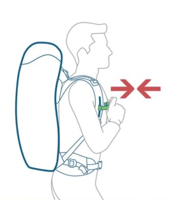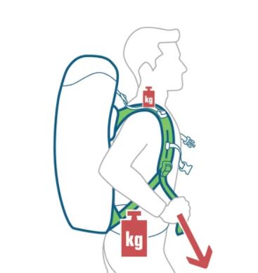 Nu de heupbanden zijn afgesteld, zal de tas naar achteren hellen. Stel nu je schouderbanden af door middel van de gespen die ter hoogte van je oksels zitten. De backpack zit goed als het rugpand strak tegen je rug zit. Ga rechtop staan en pak de verstelbanden ter hoogte van je oksels. Trek beide schouderbanden tegelijk aan, net zo hoog totdat de rugpand van je backpack strak tegen je rug komt. Zorg dat het grootste gedeelte van het gewicht van de backpack wordt opgevangen door je heupen, en niet de schouders.