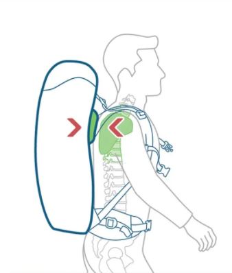 Het is belangrijk dat het ankerpunt (zie afbeelding) voor de schouderbanden tussen jouw schouderbladen ligt. De padding van de schouderbanden moet zich om de hele schouder wikkelen. Let er goed op dat dit juist zit, om spanning in de nekspieren te voorkomen.