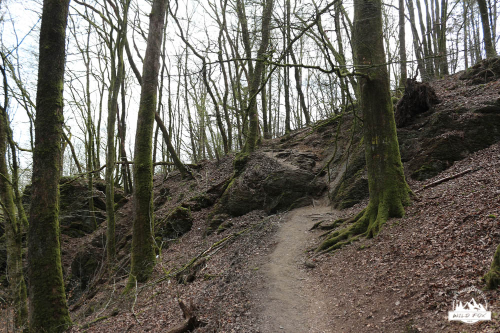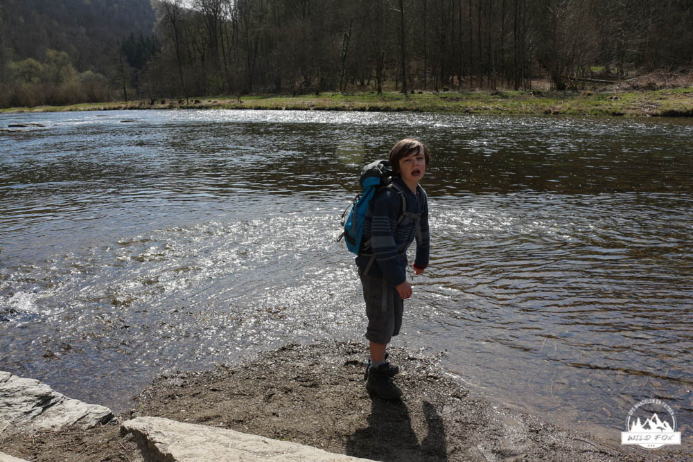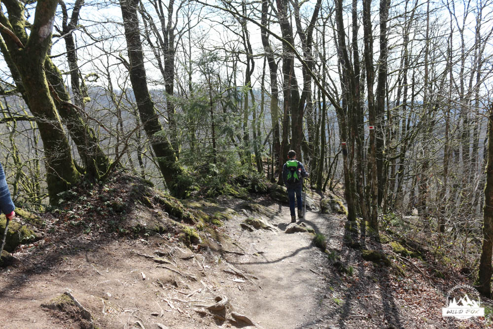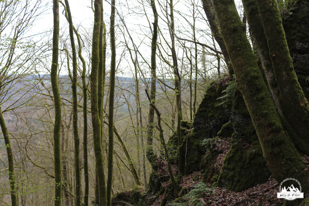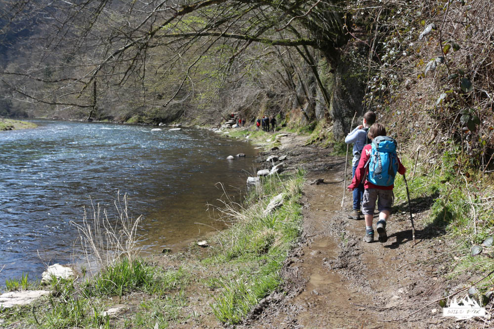Het bospad richting de oevers van de Semois is bezaaid met rotsen en wortels. Het is dus verstandig om goede wandelschoenen te dragen. Zo heb je een goede grip en dat heb je echt nodig, vooral in de herfst en de winter. Eenmaal aangekomen bij de oever van de Semois begint een makkelijk stuk. Lekkerlangs de rivier, genieten van de mooie uitzichten. Vergeet vooral niet om omhoog te kijken, dan pas zie je goed hoe ver je bent afgedaald. Maar ook, hoe hoog je straks weer omhoog moet klimmen. En voor je het weet moet je al gaan klimmen.