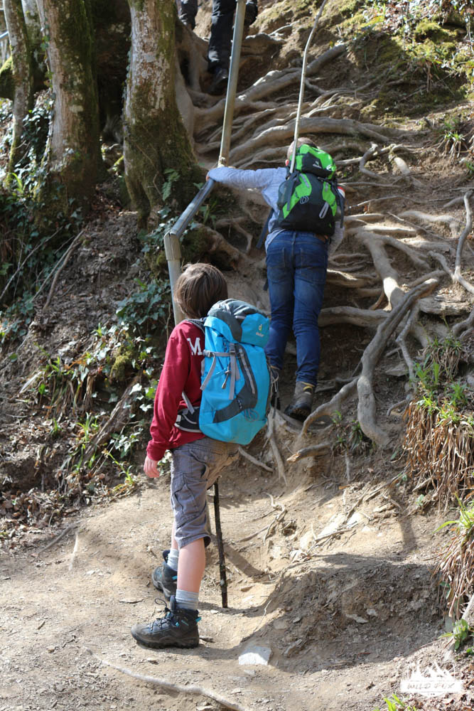 De Laddertjeswandeling begint pas echt bij het waarschuwingsbord. Er staat “gevaarlijke wandeling: af te raden aan gevoelige personen”. De vertaling in het Nederlands is niet helemaal correct maar de strekking is duidelijk. Als je slecht ter been bent, hoogtevrees hebt en bang bent aangelegd, maak dan rechtsomkeert. Maar we gaan gewoon door en al snel moet je een bizarre trap af. Deze bestaat helemaal uit boomwortels. Het is echt een steile trap en pas hier goed op en help elkaar want er is geen beplanting om je aan vast te houden. Nu weet je een beetje wat je te wachten staat!