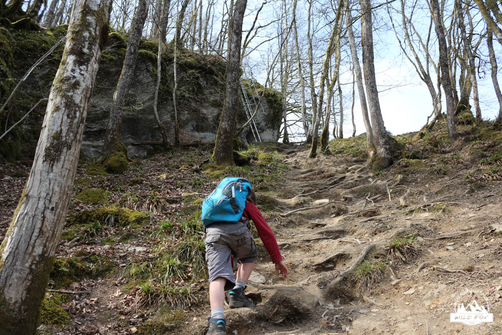 Het leukste deel van de laddertjeswandeling in Rochehaut gaat nu beginnen. Want om helemaal naar te boven te komen, moet er flink geklommen worden. De rotsen en boomstronken dienen als trappen en op sommige plekken is er metalen trapleuning aangebracht. Vervolgens kom je aan bij een metalen uitkijkplatform. Hier kan je even op adem komen en genieten van het mooie uitzicht. Niet veel verder staat de eerste ladder op je te wachten.