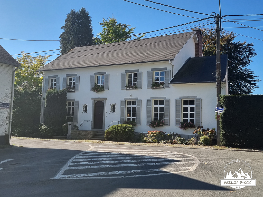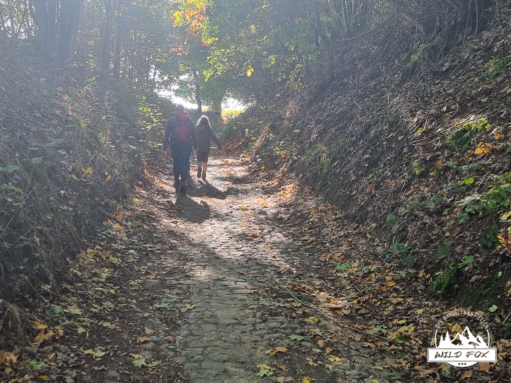 Het is een typisch stijgende holle weg, hij bijt serieus in onze kuiten. Eénmaal aangekomen beginnen we aan achteraf gezien het iets minder gedeeltje van de wandeling. We stappen in een residentieel gebied, wel nog in het bos, maar tussen de huizen.
