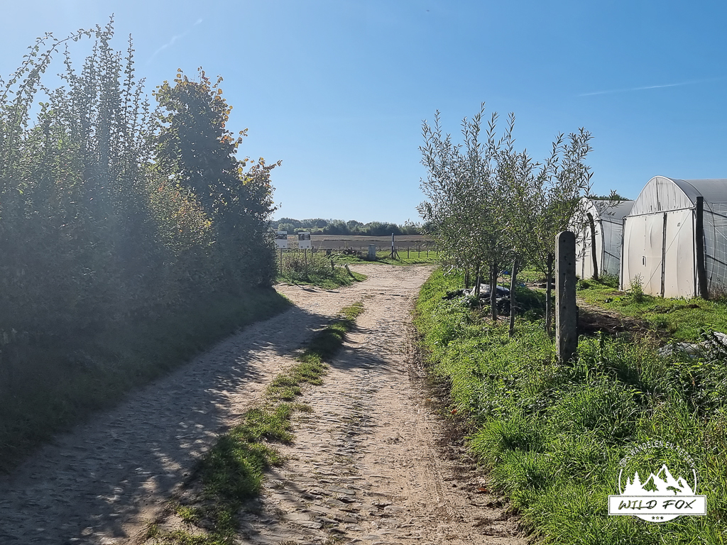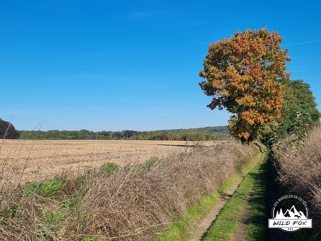 We beginnen te stappen onder de stralende zon, en wandelen al vrij snel tussen de velden en op holle wegen. Deze holle wegen vind je wel meer in deze streek. Vandaag is er blijkbaar een georganiseerde mountainbike tocht bezig, we moeten dan ook dikwijls even opzij om de fietsers door te laten. Maar dit verloop altijd wel met een ‘Hey’ of ‘Bonjour’.