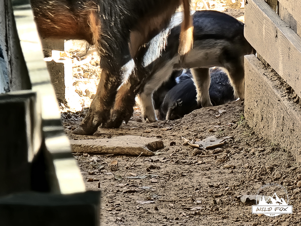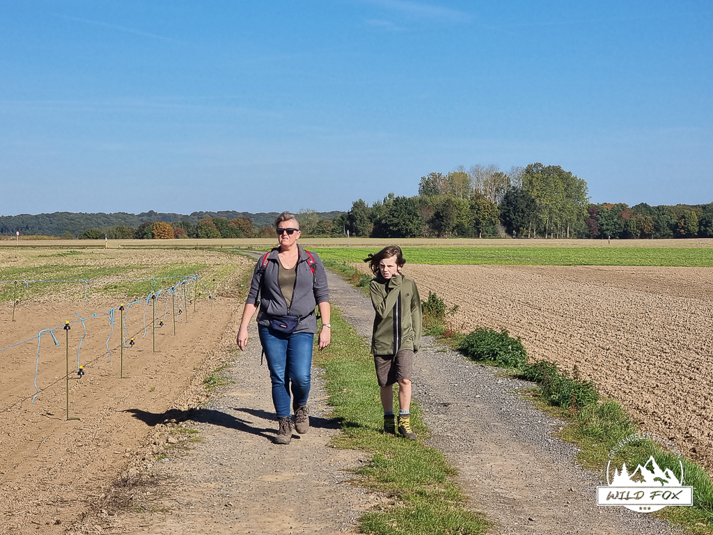 Het laatste gedeelte van de wandeling is terug in het holle weg, deze keer niet stijgend maar dalend. Onderweg komen we nog een weide tegen vol met langharige varkens. De beestjes vinden het super leuk dat onze jongens eikels over de omheining gooien, en smullen maar!