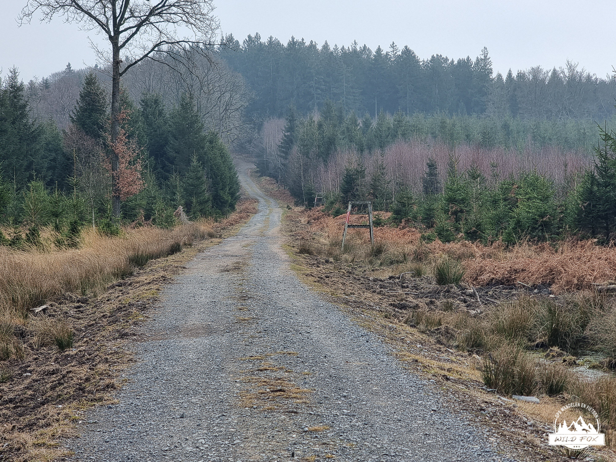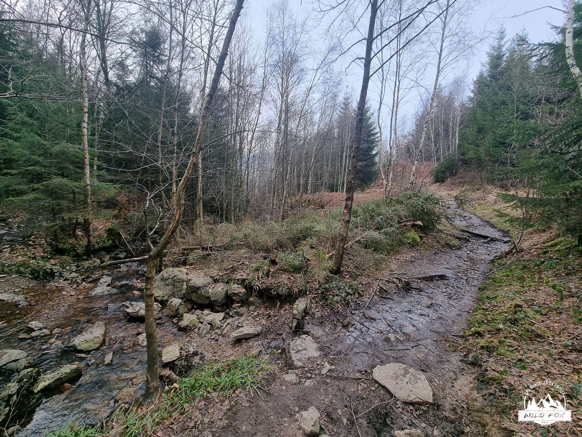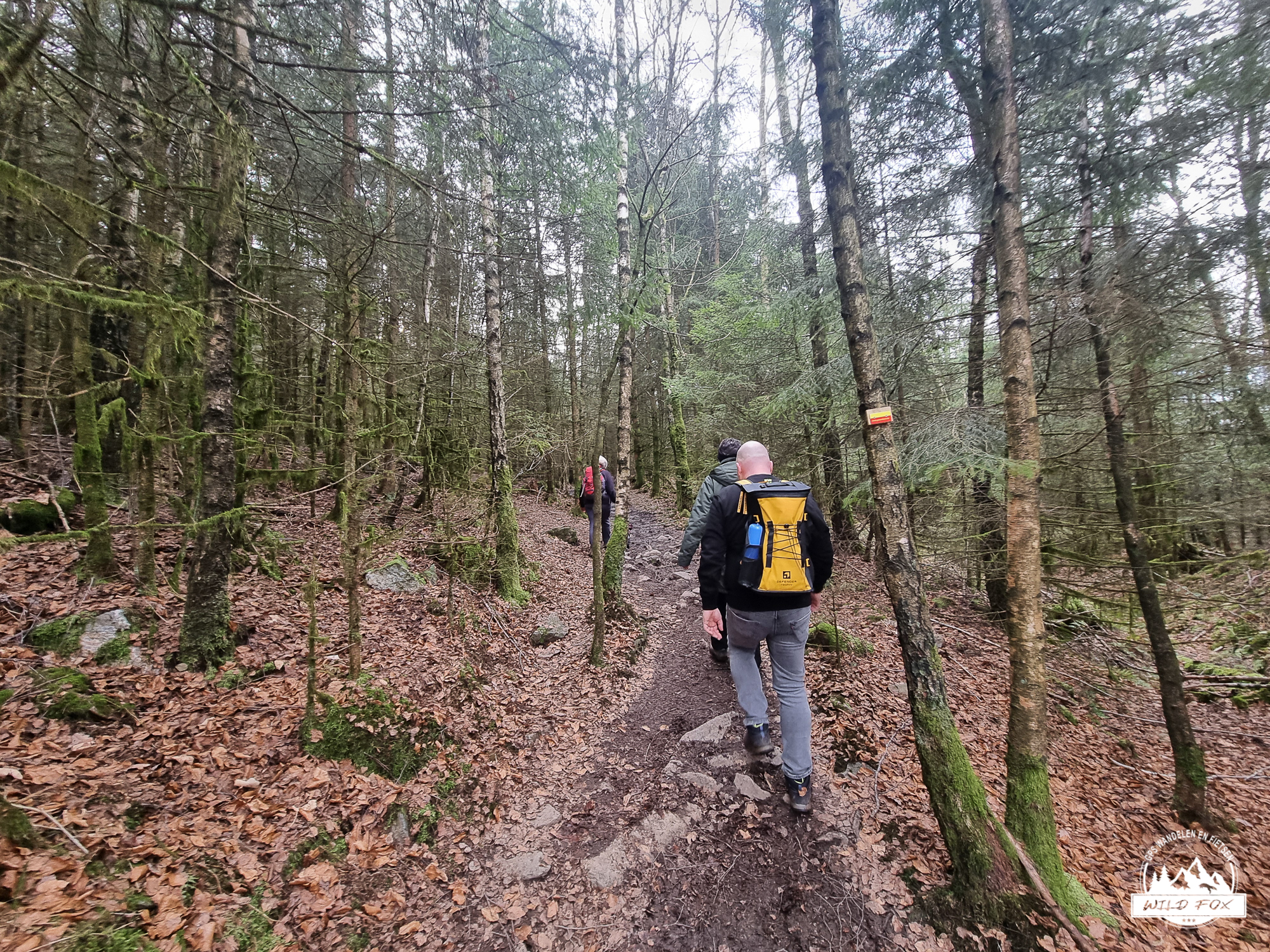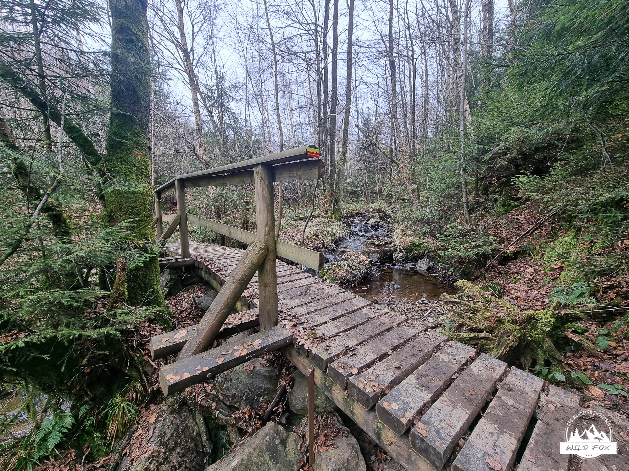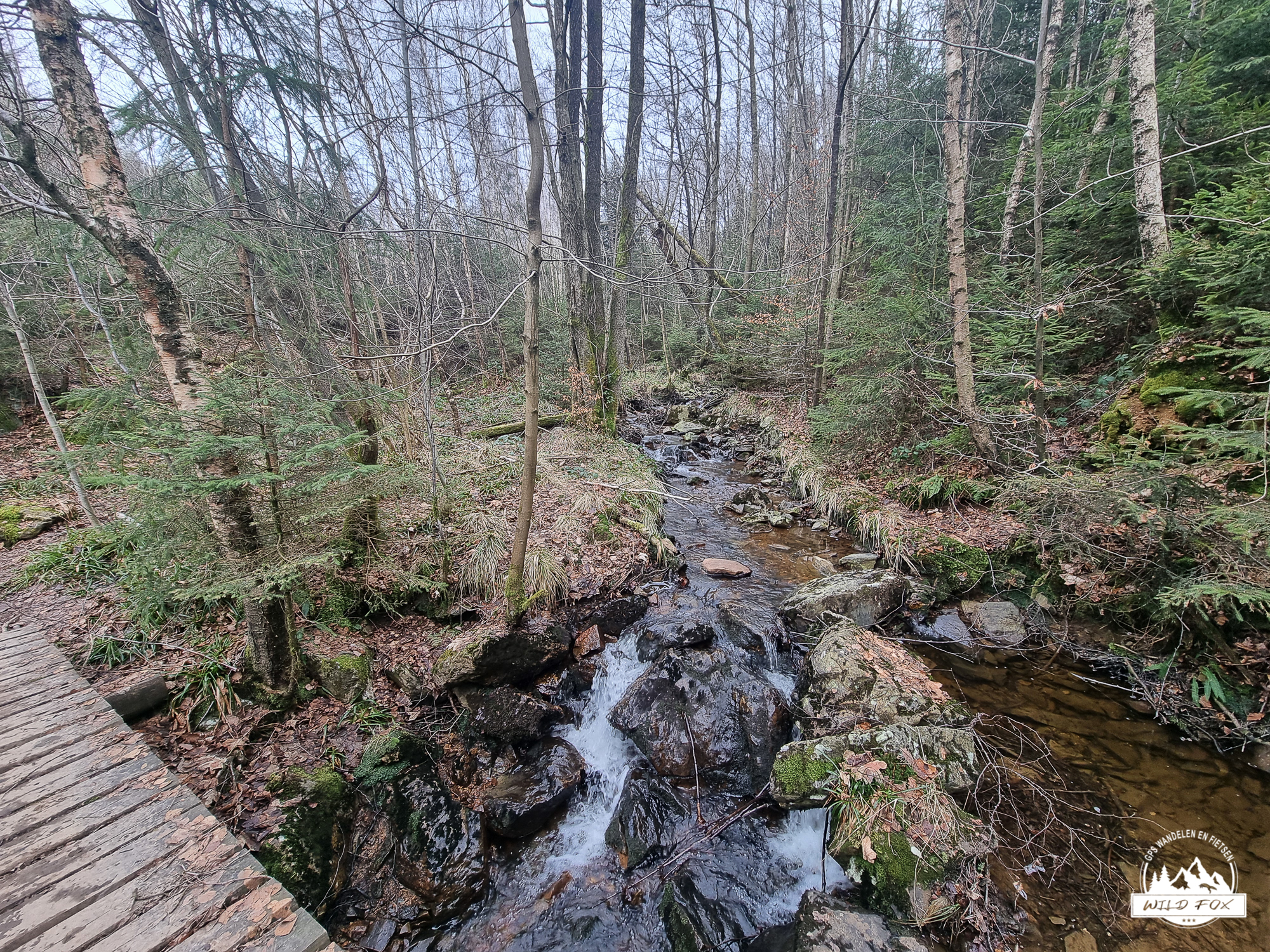 We vertrokken in het rustige Ville‑au‑Bois, een klein gehucht boven de Chefna‑vallei. Via een brede bosweg daalden we langzaam af tussen hoge sparren en vochtig loofbos, tot we het ruisen van de rivier hoorden. Beneden volgden we een stuk van de Streek‑GR, een smaller pad dat dichter bij de rivier loopt en je meteen in de sfeer van de vallei trekt.