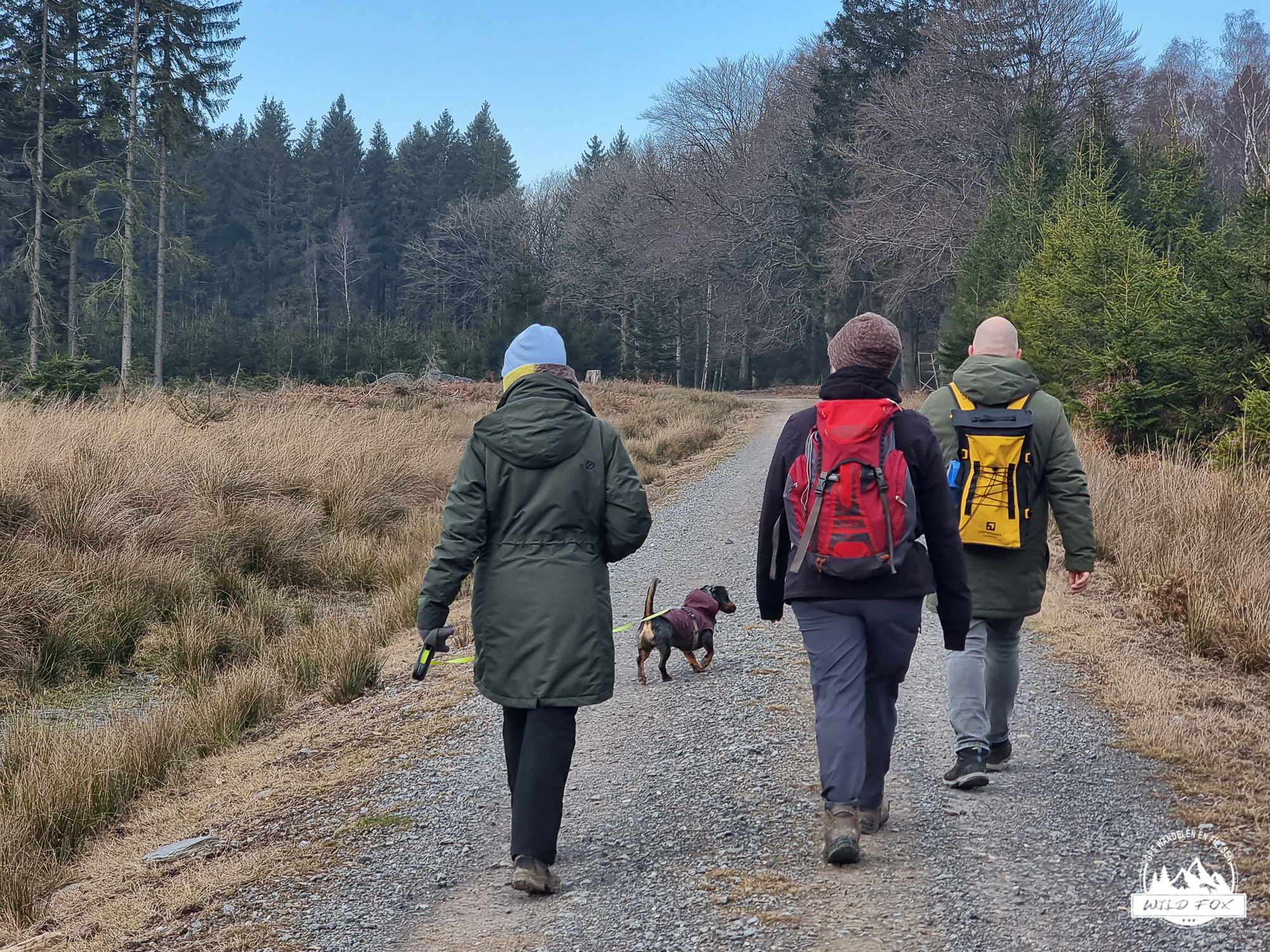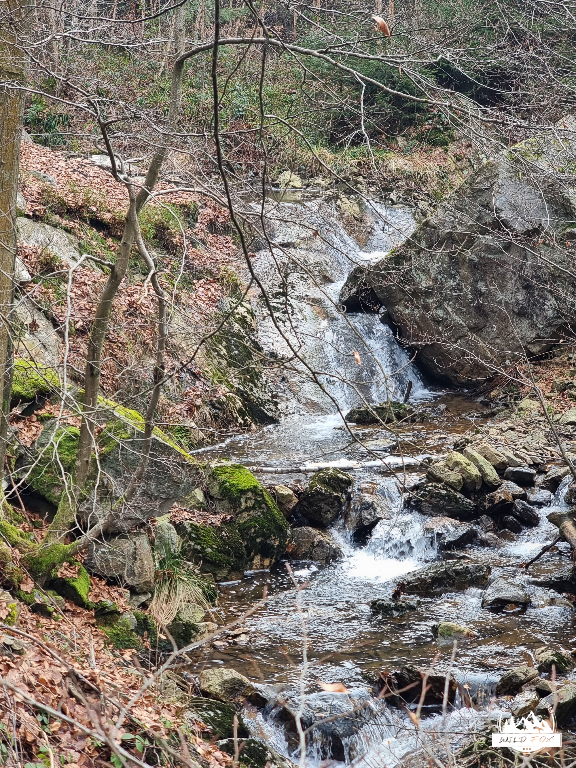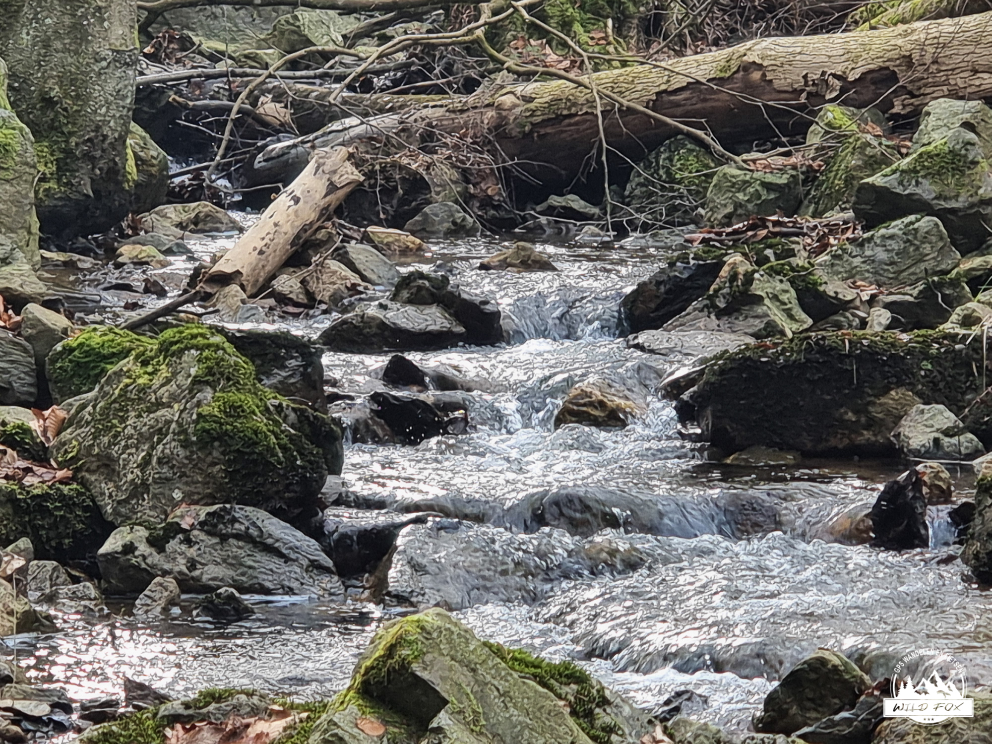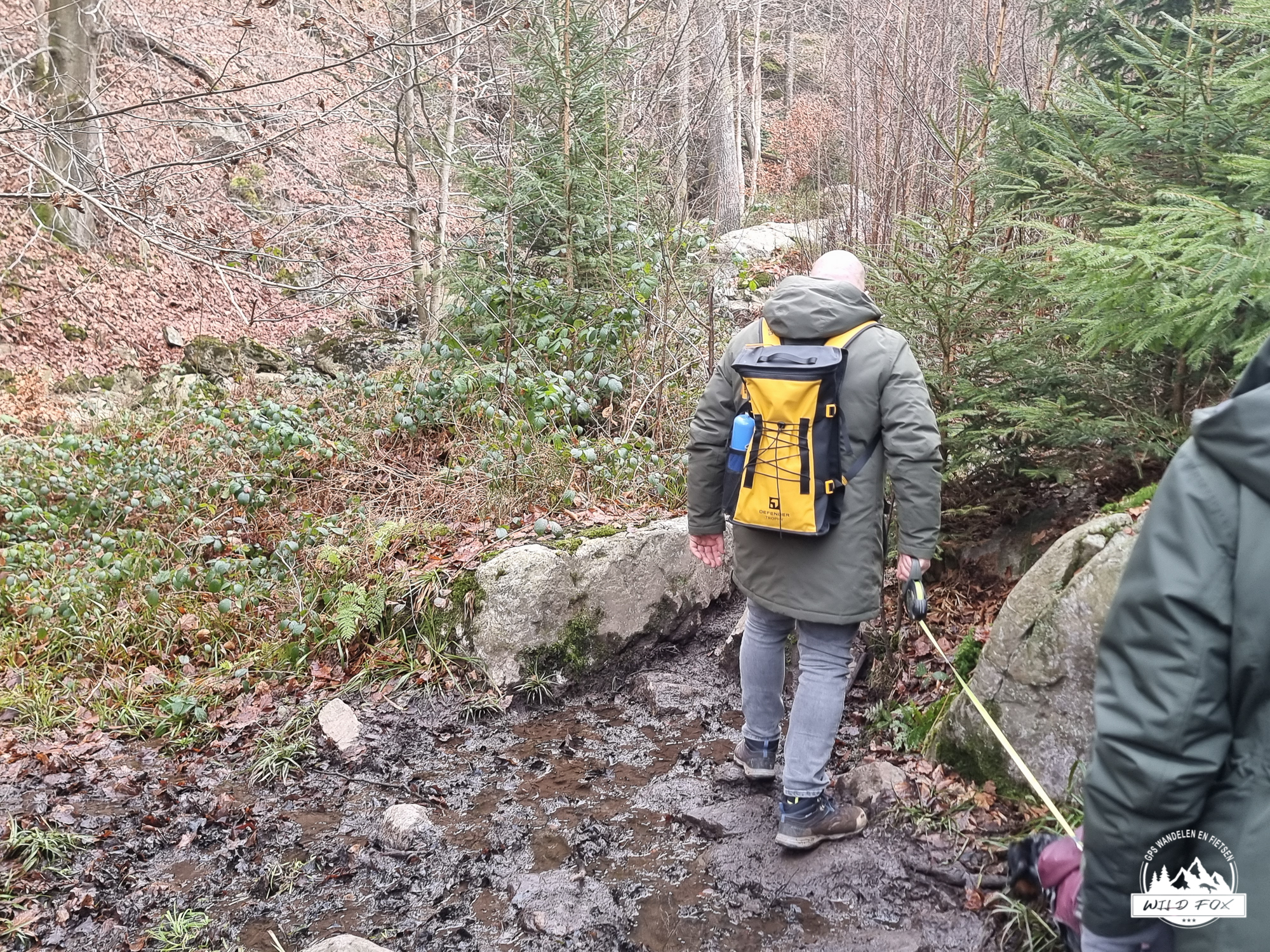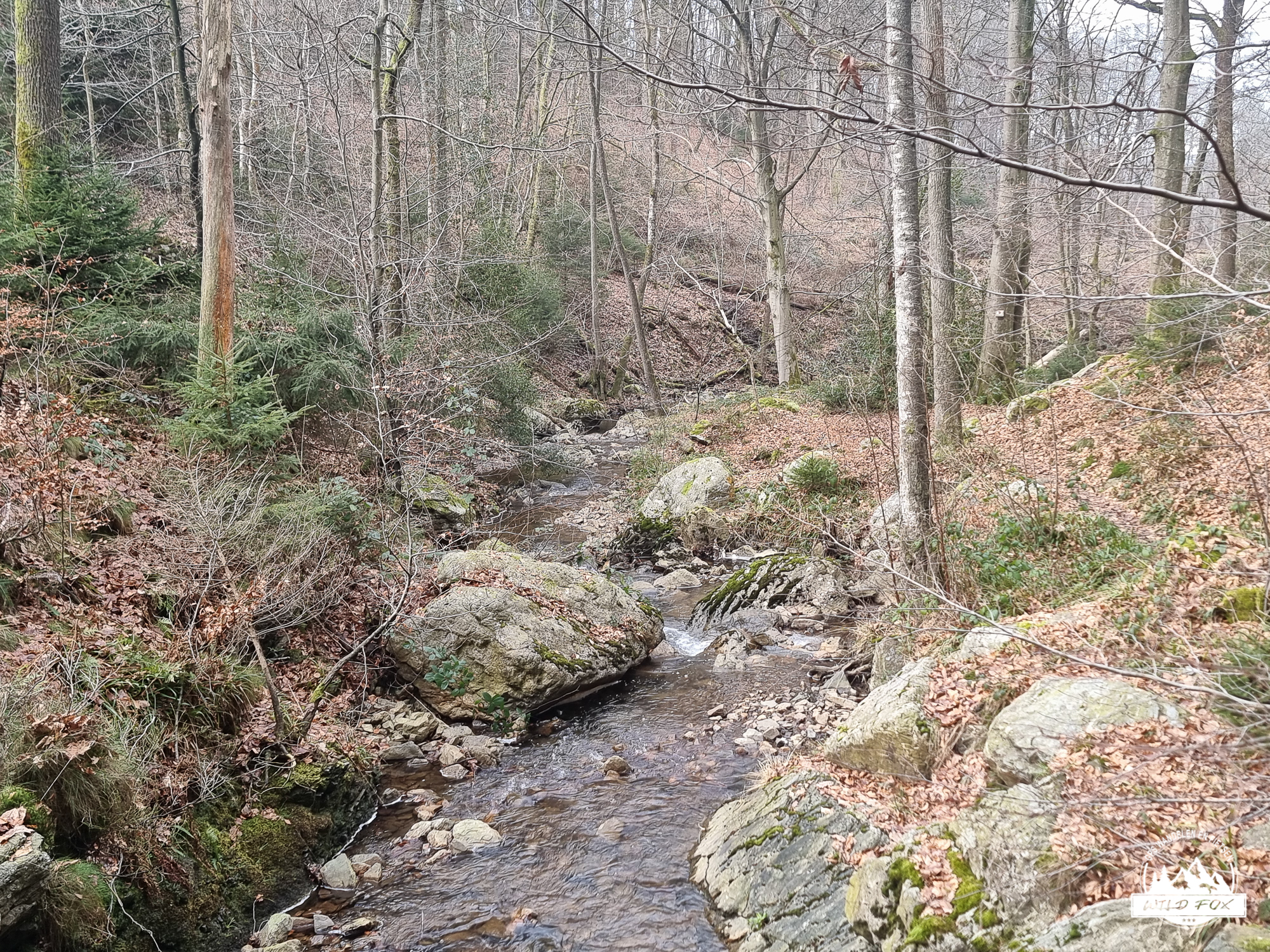 We vertrokken in het rustige Ville‑au‑Bois, een klein gehucht boven de Chefna‑vallei. Via een brede bosweg daalden we langzaam af tussen hoge sparren en vochtig loofbos, tot we het ruisen van de rivier hoorden. Beneden volgden we een stuk van de Streek‑GR, een smaller pad dat dichter bij de rivier loopt en je meteen in de sfeer van de vallei trekt.