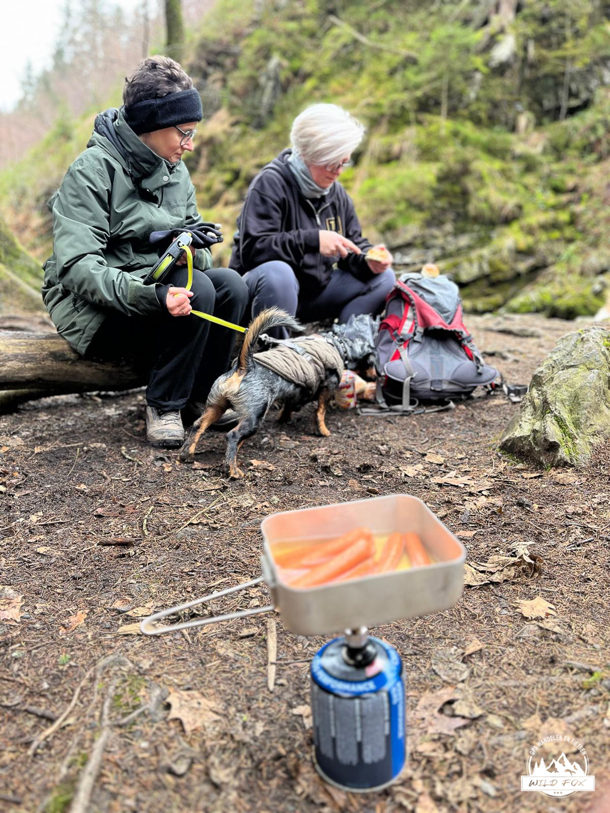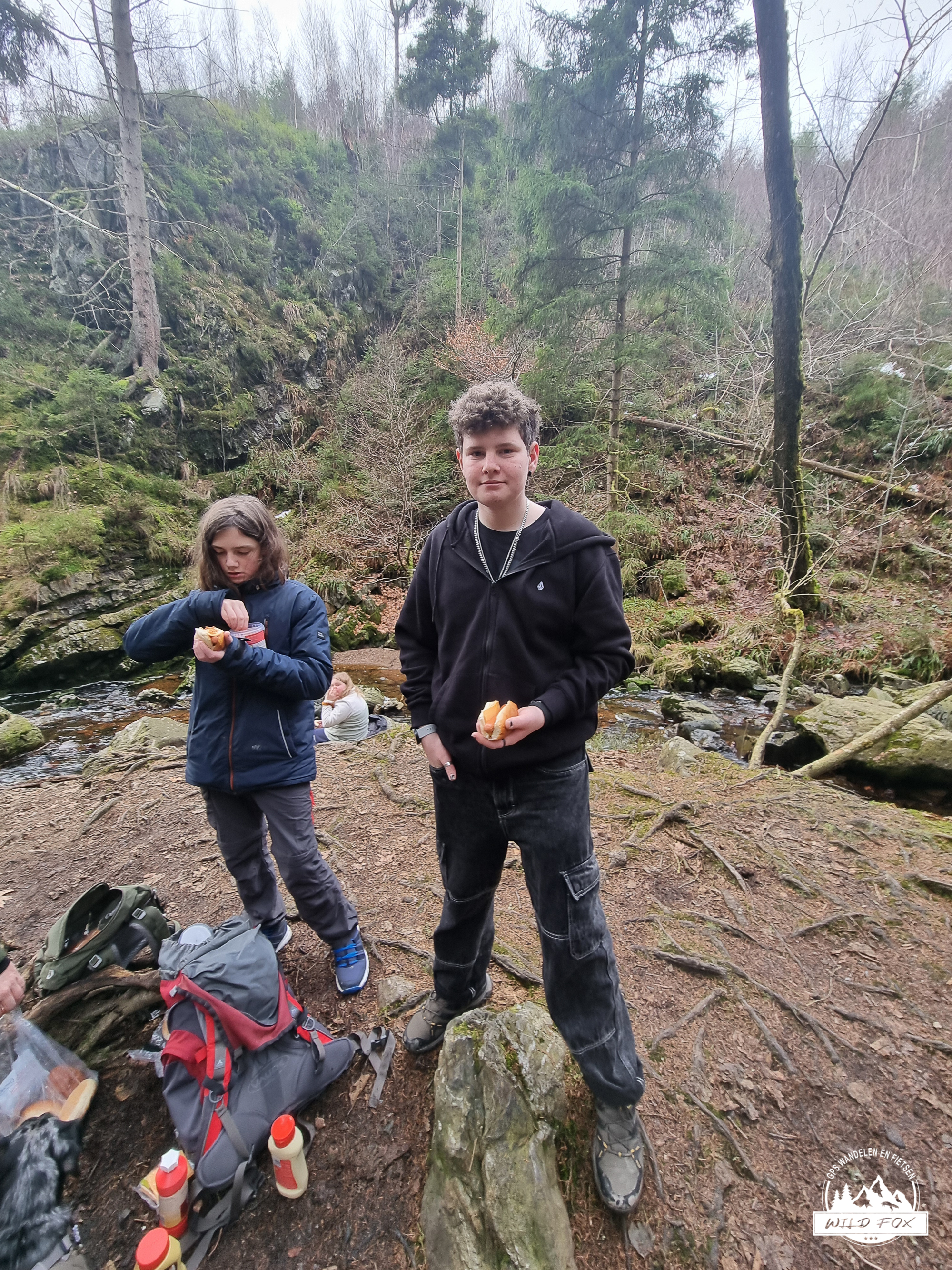 Halverwege vonden we een rustig plekje langs de rivier om even te pauzeren. Daar kwamen de hotdogs boven – een onverwacht maar heerlijk warm moment midden in de natuur. De geur van warme worstjes en broodjed mengde zich met de frisse boslucht. Het was zo’n typisch familiefragment dat je later nog vaak herinnert: lachen, delen, morsen, en genieten van iets eenvoudigs op een prachtige plek.