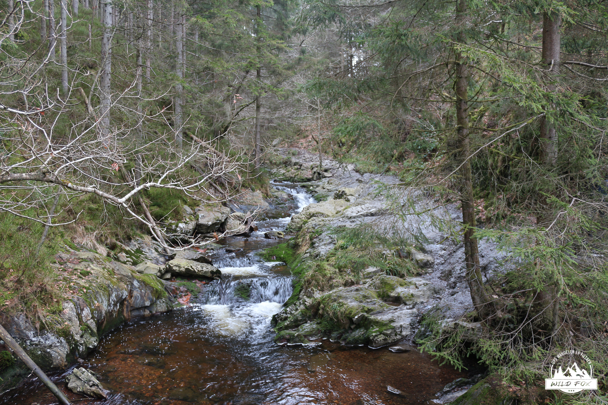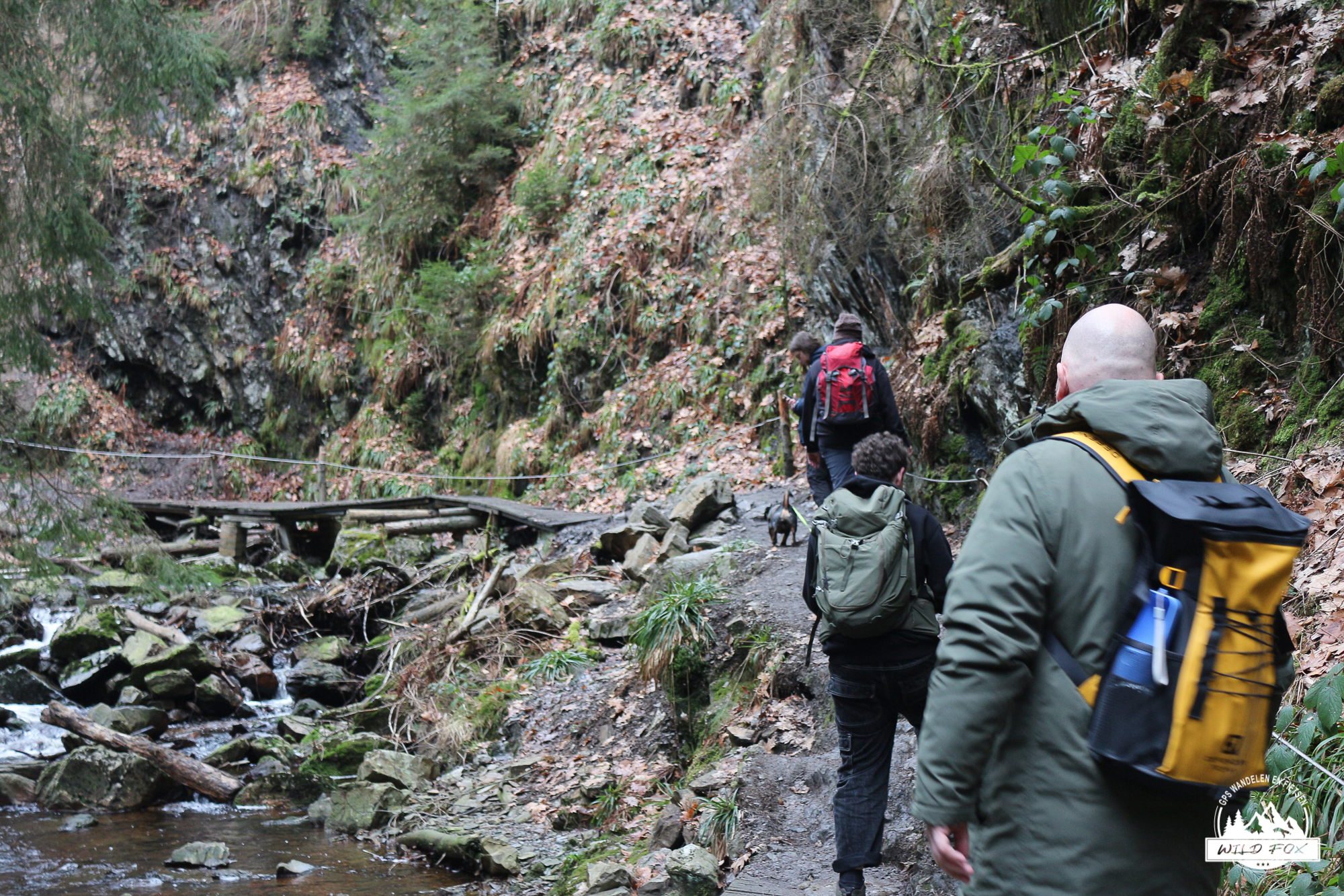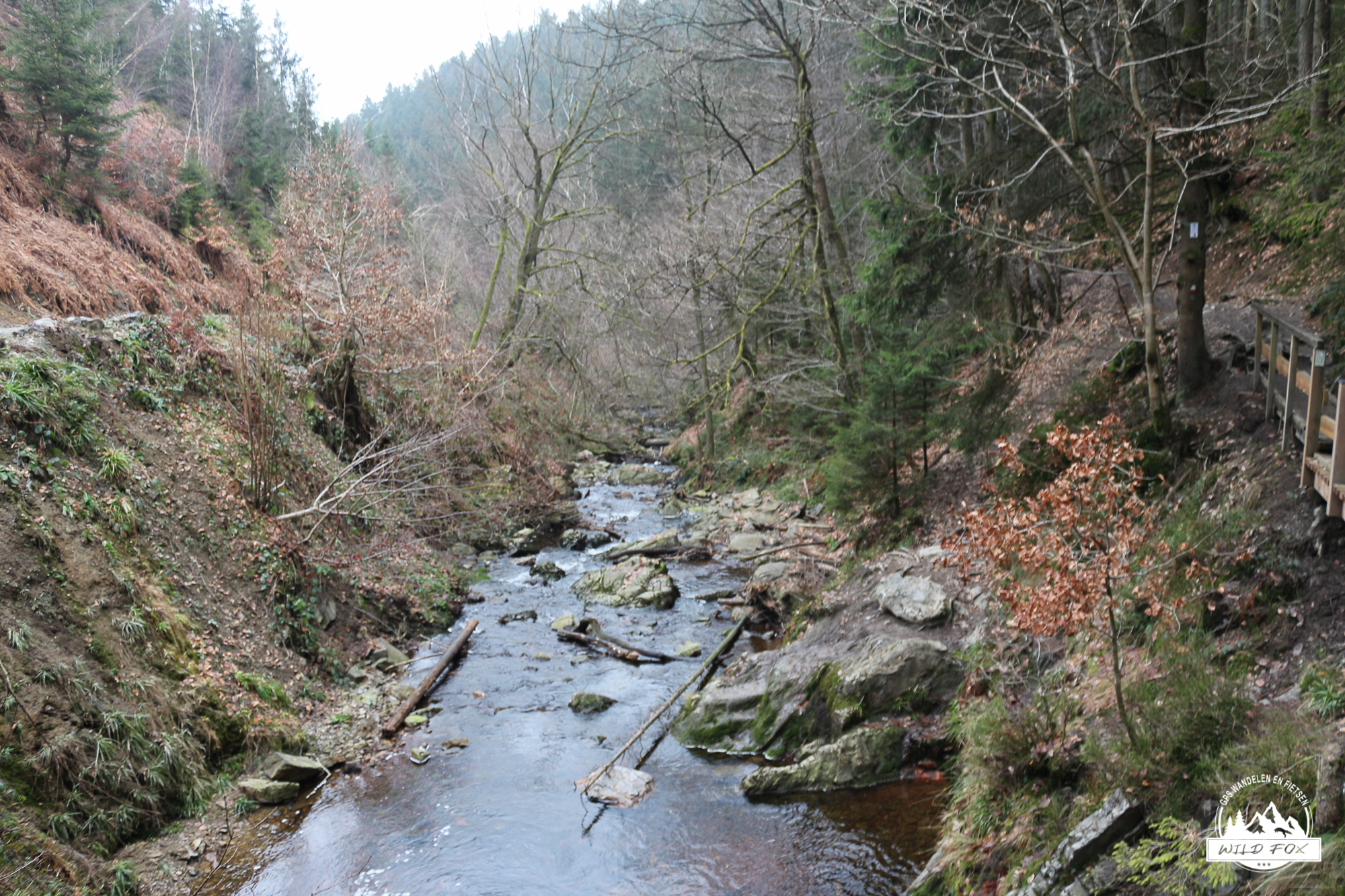 Eenmaal aan de rivier begon het mooiste stuk van de wandeling. Het pad slingerde langs de rotsige oever, soms vlak naast het water, soms hoger op de flank. De kleine watervalletjes, houten bruggetjes en smalle passages gaven het geheel een avontuurlijke toets, maar zonder ooit echt moeilijk te worden. De sneeuw die hier en daar op de rotsen lag, maakte het landschap nog fotogenieker.