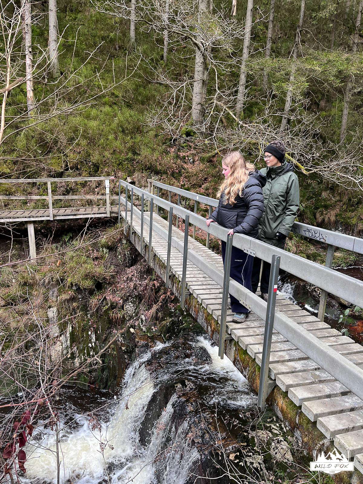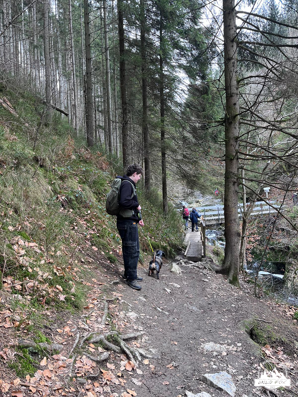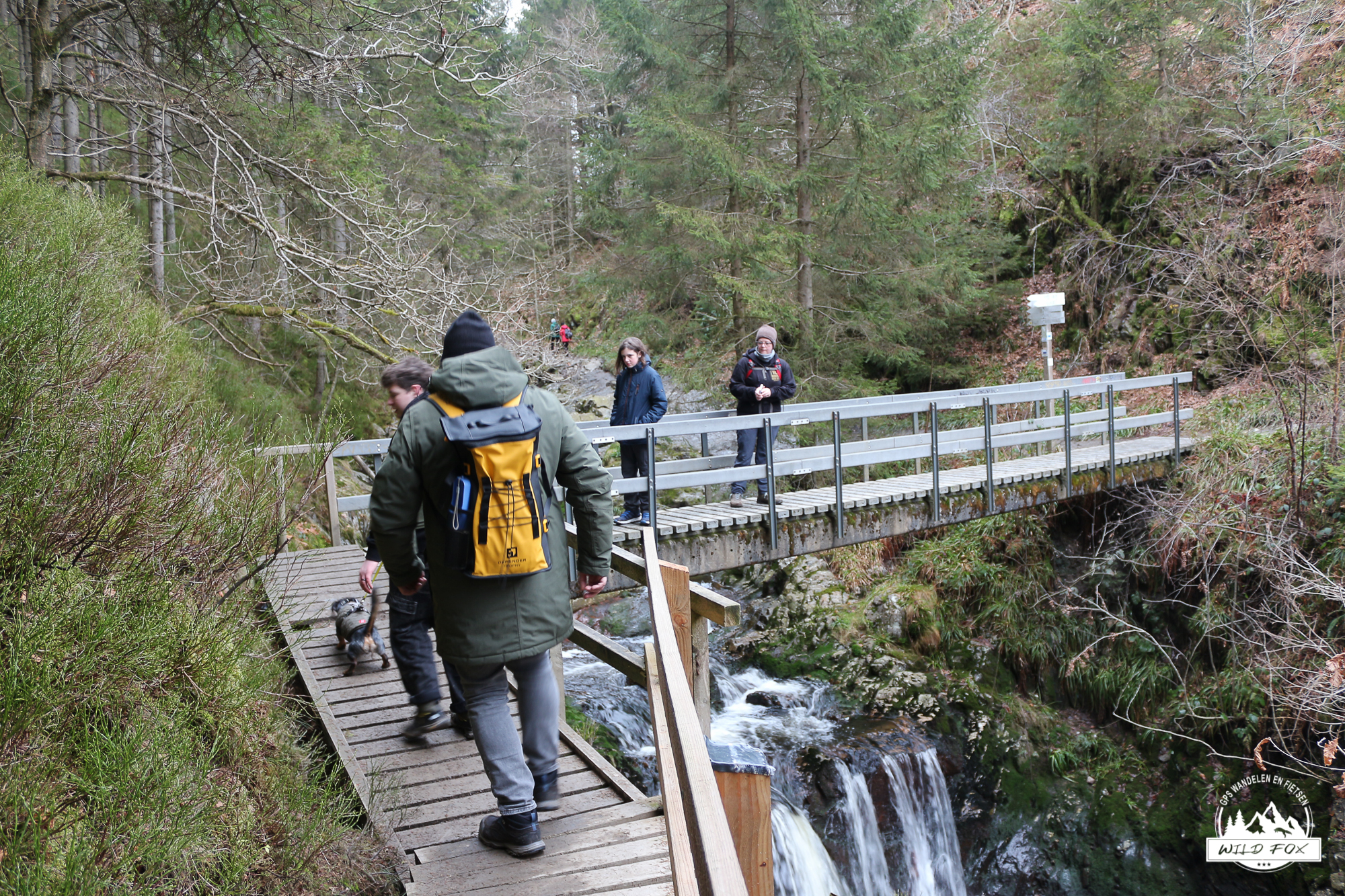 Eenmaal aan de rivier begon het mooiste stuk van de wandeling. Het pad slingerde langs de rotsige oever, soms vlak naast het water, soms hoger op de flank. De kleine watervalletjes, houten bruggetjes en smalle passages gaven het geheel een avontuurlijke toets, maar zonder ooit echt moeilijk te worden. De sneeuw die hier en daar op de rotsen lag, maakte het landschap nog fotogenieker.