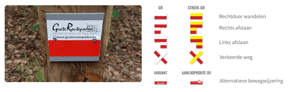 Tijd om op pad te gaan! De basismarkering bestaat uit twee strepen onder elkaar: wit-rood of geel-rood. Dit is een internationale wijze van markeren. Deze markeringen zie je op paaltjes, bomen, muren of andere beschikbare dragers en kom je vooral tegen bij splitsingen en kruispunten. Op deze plaatsen wordt ook het kruisteken gebruikt, dit is om aan te tonen dat je die weg niet moet volgen. Het afslagteken wijst op een richtingsverandering. Je kan een GR in twee richtingen stappen, zo kan je zelf kiezen waar je start- en eindpunt ligt. De topogids, de markering in het veld en de gpx-track ondersteunen elkaar. Indien een situatie ter plaatse gewijzigd is, volg dan steeds de streepjes.